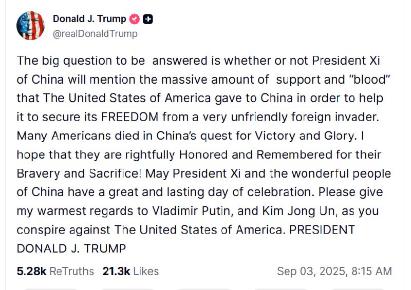 Β«ΠΠΎΠ»ΡΡΠΎΠΉ Π²ΠΎΠΏΡΠΎΡ, Π½Π° ΠΊΠΎΡΠΎΡΡΠΉ Π½ΡΠΆΠ½ΠΎ ΠΎΡΠ²Π΅ΡΠΈΡΡ, Π·Π°ΠΊΠ»ΡΡΠ°Π΅ΡΡΡ Π² ΡΠΎΠΌ, ΡΠΏΠΎΠΌΡΠ½Π΅Ρ Π»ΠΈ ΠΊΠΈΡΠ°ΠΉΡΠΊΠΈΠΉ ΠΏΡΠ΅Π΄ΡΠ΅Π΄Π°ΡΠ΅Π»Ρ Π‘ΠΈ [Π¦Π·ΠΈΠ½ΡΠΏΠΈΠ½] ΠΎ ΡΠΎΠΉ ΠΎΠ³ΡΠΎΠΌΠ½ΠΎΠΉ ΠΏΠΎΠΌΠΎΡΠΈ ΠΈ ΡΠΎΠΉ «ΠΊΡΠΎΠ²ΠΈ», ΠΊΠΎΡΠΎΡΡΠ΅ Π‘Π¨Π ΠΏΡΠ΅Π΄ΠΎΡΡΠ°Π²ΠΈΠ»ΠΈ ΠΠΈΡΠ°Ρ, ΡΡΠΎΠ±Ρ ΠΏΠΎΠΌΠΎΡΡ Π΅ΠΌΡ ΠΎΡΡΡΠΎΡΡΡ Π‘ΠΠΠΠΠΠ£ ΠΎΡ ΠΎΡΠ΅Π½Ρ Π½Π΅Π΄ΡΡΠΆΠ΅Π»ΡΠ±Π½ΠΎΠ³ΠΎ ΠΈΠ½ΠΎΡΡΡΠ°Π½Π½ΠΎΠ³ΠΎ Π·Π°Ρ Π²Π°ΡΡΠΈΠΊΠ°. ΠΠ½ΠΎΠ³ΠΈΠ΅ Π°ΠΌΠ΅ΡΠΈΠΊΠ°Π½ΡΡ ΠΏΠΎΠ³ΠΈΠ±Π»ΠΈ Π² Π±ΠΎΡΡΠ±Π΅ ΠΠΈΡΠ°Ρ Π·Π° Π΅Π³ΠΎ ΠΏΠΎΠ±Π΅Π΄Ρ ΠΈ ΡΠ»Π°Π²Ρ. Π― Π½Π°Π΄Π΅ΡΡΡ, ΡΡΠΎ ΠΈΡ ΠΏΠΎ ΠΏΡΠ°Π²Ρ Π±ΡΠ΄ΡΡ ΡΡΠΈΡΡ ΠΈ ΠΏΠΎΠΌΠ½ΠΈΡΡ Π·Π° Ρ ΡΠ°Π±ΡΠΎΡΡΡ ΠΈ ΡΠ°ΠΌΠΎΠΏΠΎΠΆΠ΅ΡΡΠ²ΠΎΠ²Π°Π½ΠΈΠ΅Β», β Π½Π°ΠΏΠΈΡΠ°Π» ΠΎΠ½ Π² ΡΠΎΡΠΈΠ°Π»ΡΠ½ΠΎΠΉ ΡΠ΅ΡΠΈ Truth Social.