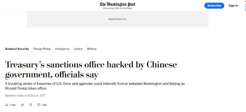Китайские хакеры взломали подразделение Минфина США, которое отвечает за санкции, и офис главы ведомства Джанет Йеллен, — сообщила The Washington Post