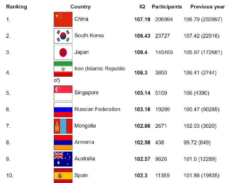 International IQ Organization опубликовал статистику среднего уровня интеллекта среди 127 стран мира. Все участники выполняли одинаковые задания. На первом месте оказался Китай, вторую и третью позицию заняли Южная Корея и Япония. Из стран ЕС в десятку самых умных попала лишь Испания. На 30-м месте обосновались США. Украина закрепилась на почётной 78 строчке. Замыкают рейтинг Ангола и Габон.