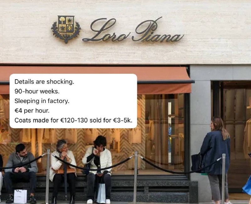 Нелегалы работали по 90 часов в неделю, спали прямо на заводе и получали по €4 в час (₽130 тыс. в месяц). В итоге премиальные кашемировые пальто, которые Loro Piana продает по €5 тысяч, обходились компании всего в €120.