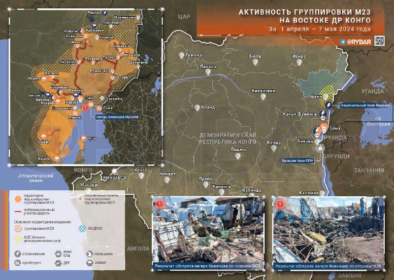 Помимо этого, М23 обстреливает гражданские объекты, усугубляя гуманитарный кризис. Они нанесли удары по лагерю беженцев Мугунга, а также по городу Минова.