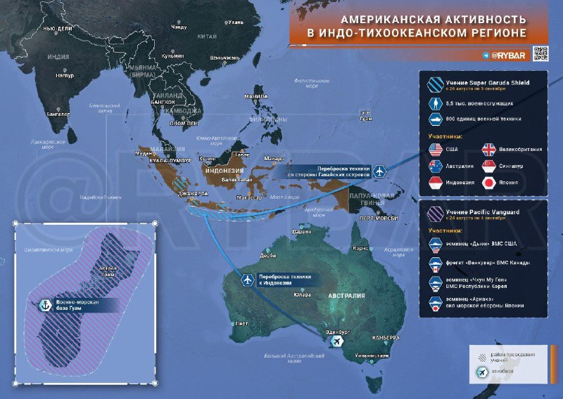 ▪️И это еще не все. Сегодня над территорией Индонезии и в акватории южнее начинается еще одна крупная тренировка, в которой отмечено присутствие США – Super Garuda Shield, и продлится она до 5 сентября.