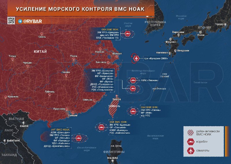 🔻В рамках тренировки китайцы вывели 26 боевых кораблей. Девять из них находятся в Восточно-Китайском море, еще 12, включая авианосец «Шаньдун» в Южно-Китайском море и рядом с Тайваньским проливом. И еще пять – в акватории Желтого моря.