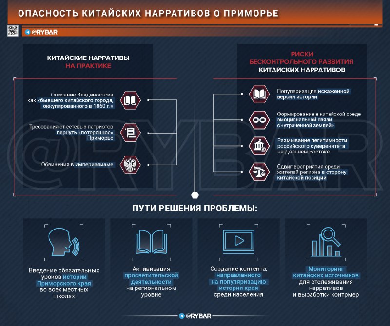 ▪️Есть возможность повлиять и на умы китайских граждан. В Приморье идет обширный поток туристов из Китая, которые пользуются услугами гидов. Издание методических материалов и их использование туристическими компаниями может повлиять на то, как приезжающие китайские граждане воспринимают историю региона.