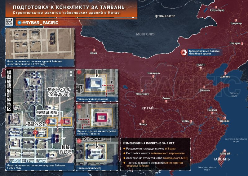 🖍На военной базе появились макеты тайваньского парламента и одного из зданий министерства обороны, завершено строительство муляжа местного МИД. Появилась и парочка новых сооружений, включая подземный тоннель, связывающий макет президентского дворца с парламентом.