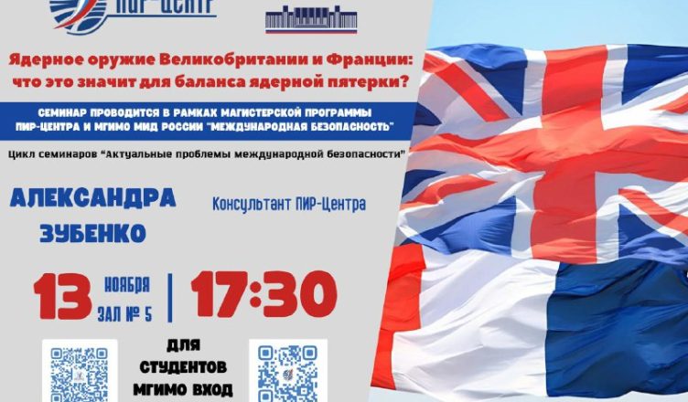 13 ноября 2025 г. ПИР-Центр совместно с МГИМО МИД России проведет семинар на тему «Ядерное оружие Великобритании и Франции: что это значит для баланса ядерной пятерки?». Мероприятие пройдет в рамках цикла семинаров «Актуальные проблемы международной безопасности».