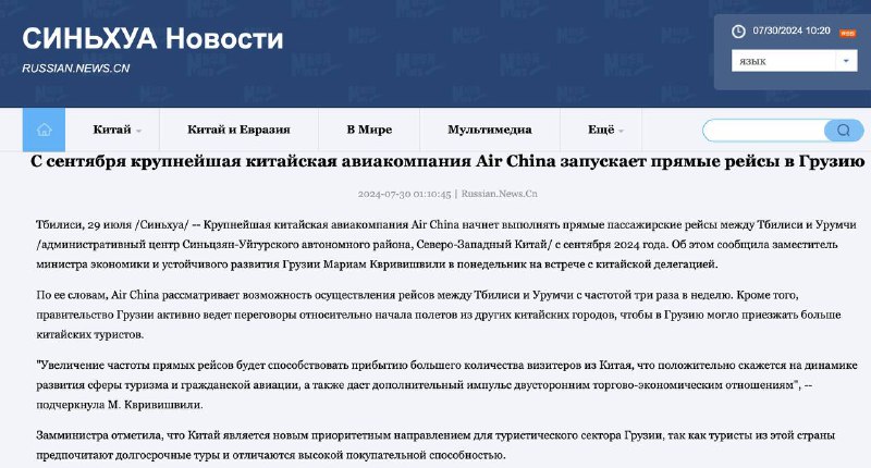 ΠΡΡΠΏΠ½Π΅ΠΉΡΠ°Ρ ΠΊΠΈΡΠ°ΠΉΡΠΊΠ°Ρ Π°Π²ΠΈΠ°ΠΊΠΎΠΌΠΏΠ°Π½ΠΈΡ Air ChinaΠ½Π°ΡΠ½Π΅Ρ Π²ΡΠΏΠΎΠ»Π½ΡΡΡ ΠΏΡΡΠΌΡΠ΅ ΠΏΠ°ΡΡΠ°ΠΆΠΈΡΡΠΊΠΈΠ΅ ΡΠ΅ΠΉΡΡ ΠΌΠ΅ΠΆΠ΄Ρ Π’Π±ΠΈΠ»ΠΈΡΠΈ ΠΈ Π£ΡΡΠΌΡΠΈ /Π°Π΄ΠΌΠΈΠ½ΠΈΡΡΡΠ°ΡΠΈΠ²Π½ΡΠΉ ΡΠ΅Π½ΡΡ Π‘ΠΈΠ½ΡΡΠ·ΡΠ½-Π£ΠΉΠ³ΡΡΡΠΊΠΎΠ³ΠΎ Π°Π²ΡΠΎΠ½ΠΎΠΌΠ½ΠΎΠ³ΠΎ ΡΠ°ΠΉΠΎΠ½Π°, Π‘Π΅Π²Π΅ΡΠΎ-ΠΠ°ΠΏΠ°Π΄Π½ΡΠΉ ΠΠΈΡΠ°ΠΉ/ Ρ ΡΠ΅Π½ΡΡΠ±ΡΡ 2024 Π³ΠΎΠ΄Π°. ΠΠ± ΡΡΠΎΠΌ ΡΠΎΠΎΠ±ΡΠΈΠ»Π° Π·Π°ΠΌΠ΅ΡΡΠΈΡΠ΅Π»Ρ ΠΌΠΈΠ½ΠΈΡΡΡΠ° ΡΠΊΠΎΠ½ΠΎΠΌΠΈΠΊΠΈ ΠΈ ΡΡΡΠΎΠΉΡΠΈΠ²ΠΎΠ³ΠΎ ΡΠ°Π·Π²ΠΈΡΠΈΡ ΠΡΡΠ·ΠΈΠΈ ΠΠ°ΡΠΈΠ°ΠΌ ΠΠ²ΡΠΈΠ²ΠΈΡΠ²ΠΈΠ»ΠΈΠ² ΠΏΠΎΠ½Π΅Π΄Π΅Π»ΡΠ½ΠΈΠΊ Π½Π° Π²ΡΡΡΠ΅ΡΠ΅ Ρ ΠΊΠΈΡΠ°ΠΉΡΠΊΠΎΠΉ Π΄Π΅Π»Π΅Π³Π°ΡΠΈΠ΅ΠΉ.