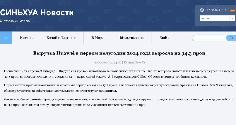 Π½ΠΎΠ»ΠΎΠ³ΠΈΡΠ΅ΡΠΊΠΎΠ³ΠΎ Π³ΠΈΠ³Π°Π½ΡΠ° Huawei Π² ΠΏΠ΅ΡΠ²ΠΎΠΌ ΠΏΠΎΠ»ΡΠ³ΠΎΠ΄ΠΈΠΈ ΡΠ΅ΠΊΡΡΠ΅Π³ΠΎ Π³ΠΎΠ΄Π° ΡΠ²Π΅Π»ΠΈΡΠΈΠ»Π°ΡΡ Π½Π° 34,3 ΠΏΡΠΎΡ. Π² Π³ΠΎΠ΄ΠΎΠ²ΠΎΠΌ ΠΈΡΡΠΈΡΠ»Π΅Π½ΠΈΠΈ, ΡΠΎΡΡΠ°Π²ΠΈΠ² 417,5 ΠΌΠ»ΡΠ΄ ΡΠ°Π½Π΅ΠΉ /ΠΎΠΊΠΎΠ»ΠΎ 58,6 ΠΌΠ»ΡΠ΄ Π΄ΠΎΠ»Π»Π°ΡΠΎΠ² Π‘Π¨Π/. ΠΠ± ΡΡΠΎΠΌ Π² ΡΠ΅ΡΠ²Π΅ΡΠ³ ΡΠΎΠΎΠ±ΡΠΈΠ»Π° ΠΊΠΎΠΌΠΏΠ°Π½ΠΈΡ.