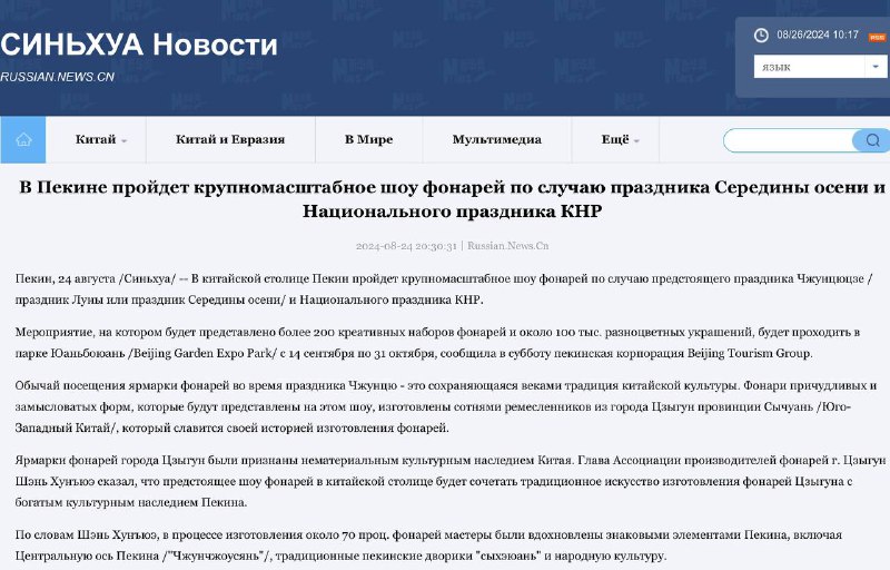🖼 В Пекине пройдет крупномасштабное шоу фонарей по случаю праздника Середины ос…