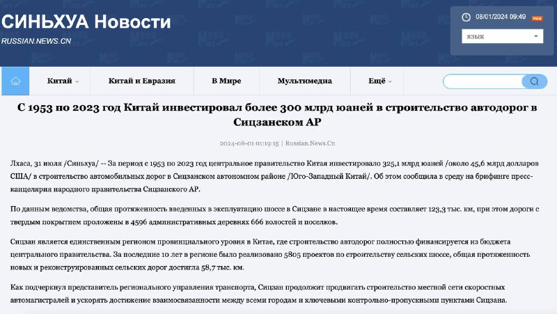 С 1953 по 2023 год Китай инвестировал более 300 млрд юаней в строительство автодорог в Сицзанском АР