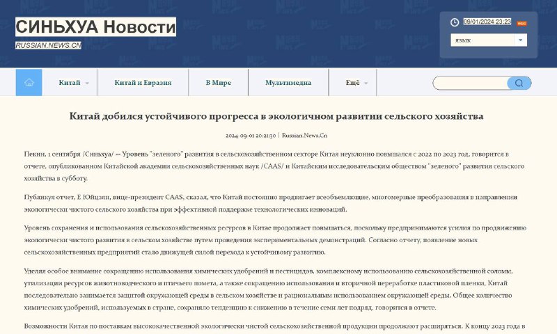 Китай добился устойчивого прогресса в экологичном развитии сельского хозяйства