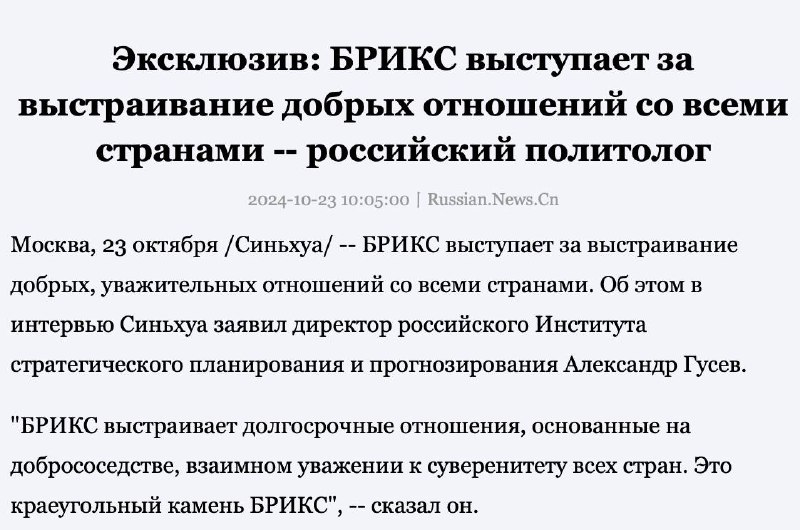 БРИКС выступает за выстраивание добрых, уважительных отношений со всеми странами. Об этом в интервью Синьхуа заявил директор российского Института стратегического планирования и прогнозирования Александр Гусев.