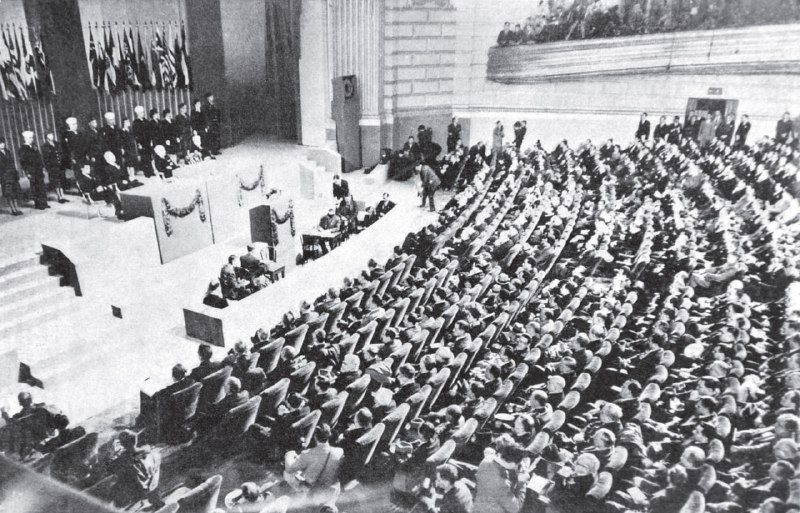 1945 Π³., 25 Π°ΠΏΡΠ΅Π»Ρ. ΠΠ΅ΠΆΠ΄ΡΠ½Π°ΡΠΎΠ΄Π½ΠΎΠ΅ ΡΠΎΠ²Π΅ΡΠ°Π½ΠΈΠ΅ ΠΏΠΎ ΡΠΎΠ·Π΄Π°Π½ΠΈΡ ΠΠΠ Π² Π‘Π°Π½-Π€ΡΠ°Π½ΡΠΈΡΠΊΠΎ. ΠΠΈΡΠ°ΠΉ ΠΏΡΠ΅Π΄ΡΡΠ°Π²Π»ΡΠ»Π° Π΄Π΅Π»Π΅Π³Π°ΡΠΈΡ ΠΈΠ· ΠΏΠΎΡΡΠΈ 100 ΡΠ΅Π»ΠΎΠ²Π΅ΠΊ.