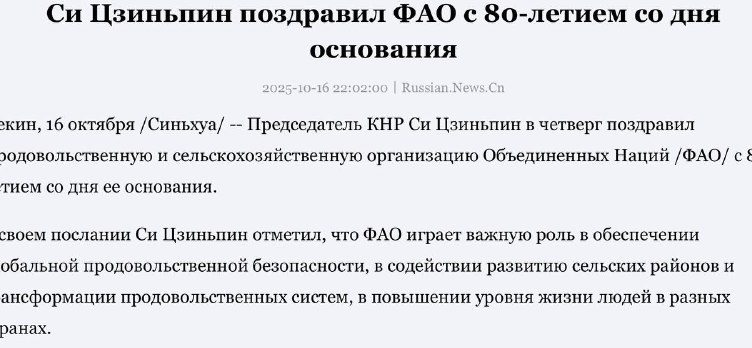 Π ΡΠ²ΠΎΠ΅ΠΌ ΠΏΠΎΡΠ»Π°Π½ΠΈΠΈ Π‘ΠΈ Π¦Π·ΠΈΠ½ΡΠΏΠΈΠ½ ΠΎΡΠΌΠ΅ΡΠΈΠ», ΡΡΠΎ Π€ΠΠ ΠΈΠ³ΡΠ°Π΅Ρ Π²Π°ΠΆΠ½ΡΡ ΡΠΎΠ»Ρ Π² ΠΎΠ±Π΅ΡΠΏΠ΅ΡΠ΅Π½ΠΈΠΈ Π³Π»ΠΎΠ±Π°Π»ΡΠ½ΠΎΠΉ ΠΏΡΠΎΠ΄ΠΎΠ²ΠΎΠ»ΡΡΡΠ²Π΅Π½Π½ΠΎΠΉ Π±Π΅Π·ΠΎΠΏΠ°ΡΠ½ΠΎΡΡΠΈ, Π² ΡΠΎΠ΄Π΅ΠΉΡΡΠ²ΠΈΠΈ ΡΠ°Π·Π²ΠΈΡΠΈΡ ΡΠ΅Π»ΡΡΠΊΠΈΡ