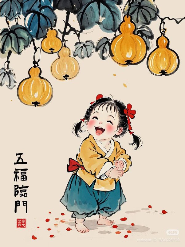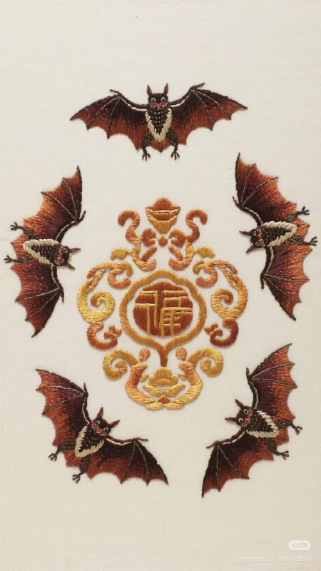 Китайская идиома «Пять благословений стучатся в двери» (五福临门) Эта фраза произошла из конфуцианской книги «Шу цзин» (書經, Книга истории). В главе Хун фань (洪范, Великий закон) упоминается о стремлении к «пяти благословениями», под которыми подразумеваются долголетие, богатство, здоровье, добродетель и «хорошая смерть». Долголетие (寿)- это пожелание прожить жизнь в полную силу. Богатство (富)- это возможность жить комфортно и обеспечить свою семью. Здоровье (康宁)- это душевный покой и благополучие. Добродетель (德)- это любовь к добру, чистота помыслов и поступков. «Хорошая смерть» (考终命)- смерть в преклонном возрасте. Концепция «пяти благословений» часто изображается визуально, особенно во время праздников и в декоративно-прикладном искусстве. Одним из таких примеров является летучая мышь. По-китайски летучая мышь 蝙蝠, второй слог в этом слове созвучен со словом счастье 福 fú. Поэтому изображение пяти летучих мышей является прямым визуальным каламбуром, означающим «пять благословений».
