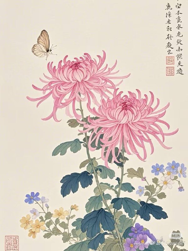 Цветы хризантемы 菊花 — символ осени и долголетия. Хризантема — это главный цветок осени, символ собранного урожая и уходящей красоты. Девятый месяц лунного года (ноябрь-декабрь) даже так и назывется «месяц хризантем». Хризантемы в Китае начинают цвести ранней осенью, когда почти все цветы осыпались. Ее стойкость перед осенними ветрами сделала ее символом благородства и несгибаемой воли. Она учит нас сохранять достоинство и внутреннюю силу даже в самые сложные периоды жизни. Ее изящные лепестки могут быть от нежных белых и солнечно-жёлтых до красных и фиолетовых. Хризантемы также использую как лечебное средство в китайской медицине. Из цветков готовят чай, который помогает продлевать жизнь и сохранять молодость. Кроме того, хризантемы занимают особое место в китайской живописи и каллиграфии среди «четырёх благородных растений» вместе с орхидеей, бамбуком и сливой.